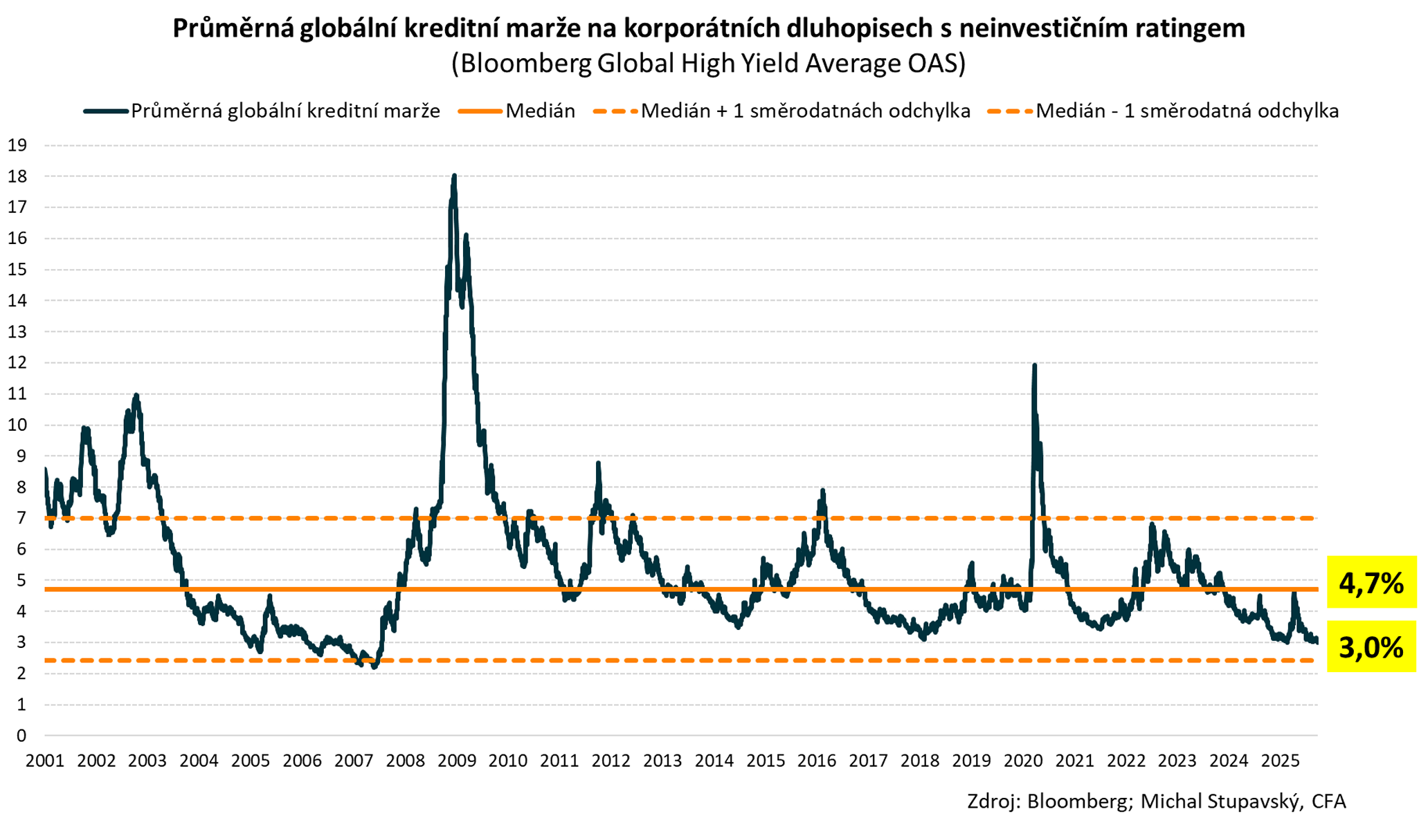 Kreditní prémie high-yield dluhopisů na dlouhodobých minimech, zdroj: Conseq