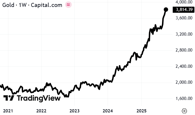 Není se tak čemu divit, že investoři se ve světle dění ve Spojených státech odklánějí od dolaru, a naopak hledají útočiště ve zlatu. Tomu hraje do karet napjatá geopolitika, zvýšená nejistota a nákupní apetit ze strany centrálních bank. Podíl zlatých rezerv mimo jiné navyšuje i ČNB a celá řada dalších centrálních bank, zejména těch z rozvíjejících se zemí. Zlato tak pokořilo hranici 3 800 USD za unci a za poslední 3 roky v dolarovém vyjádření zhodnotilo o astronomických 125 %.
